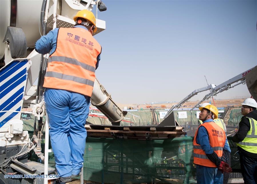 EL CAIRO, febrero 25, 2019 (Xinhua) -- Personas trabajan en el sitio de construcción en la nueva capital administrativa de Egipto, a unos 45 kilómetros al este de El Cairo, Egipto, el 25 de febrero de 2019. El primer ministro de Egipto, Mostafa Madbouly, elogió el lunes los avances de la China State Construction Engineering Corporation (CSCEC) en la construcción de la "Torre Icónica" como parte del proyecto del Distrito de Negocios Central de la nueva capital administrativa de Egipto, a unos 45 kilómetros al este de El Cairo. (Xinhua/Wu Huiwo)
