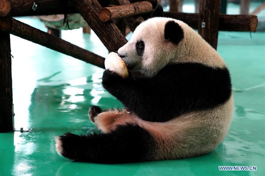 Shanghai, 23/07/2019 (El Pueblo en Línea) - El 21 de julio de 2019, un panda gigante recibe un alimento en hielo en el Parque Zoológico de Shanghai. El parque ha tomado medidas para proteger a sus animales del calor. (Xinhua/Zhang Jiansong)