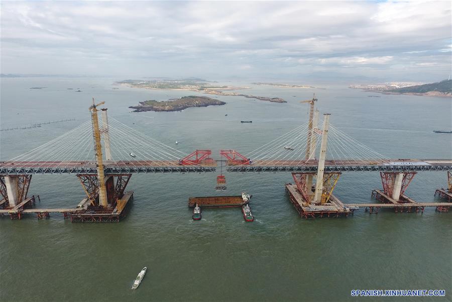 Imagen del 21 de septiembre de 2019 de una vista aérea de una viga de acero siendo levantada por una grúa en la obra de construcción del puente combinado tren-carretera del estrecho de Pingtan, en la provincia de Fujian, en el sureste de China. China completó el miércoles la estructura principal del puente marítimo combinado tren-carretera más largo del mundo, en la provincia suroriental de Fujian. La última viga de acero, con un peso de 473 toneladas, fue atornillada en horas de la ma?ana en el puente del estrecho de Pingtan, otro megaproyecto de China. Con una longitud de 16,34 kilómetros, la estructura conecta la isla de Pingtan y cuatro islotes cercanos con la provincia de Fujian de la parte continental. (Xinhua/Lin Shanchuan)