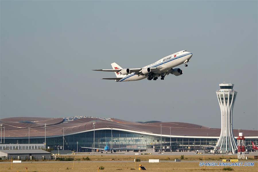 El vuelo CA9597 de Air China despega en el Aeropuerto Internacional Daxing, en Beijing, capital de China, el 25 de septiembre de 2019. El nuevo Aeropuerto Internacional Daxing de Beijing registró el miércoles su primer vuelo, la partida de un avión de la compa?ía nacional China Southern Airlines. Situada a 46 kilómetros al sur del centro de Beijing, la obra tiene la forma de un ave fénix con las alas extendidas. Se espera que para 2025 esté atendiendo 72 millones de pasajeros y manejando 2 millones de toneladas de carga al a?o, con 620.000 despegues y aterrizajes. (Xinhua/Ju Huanzong)