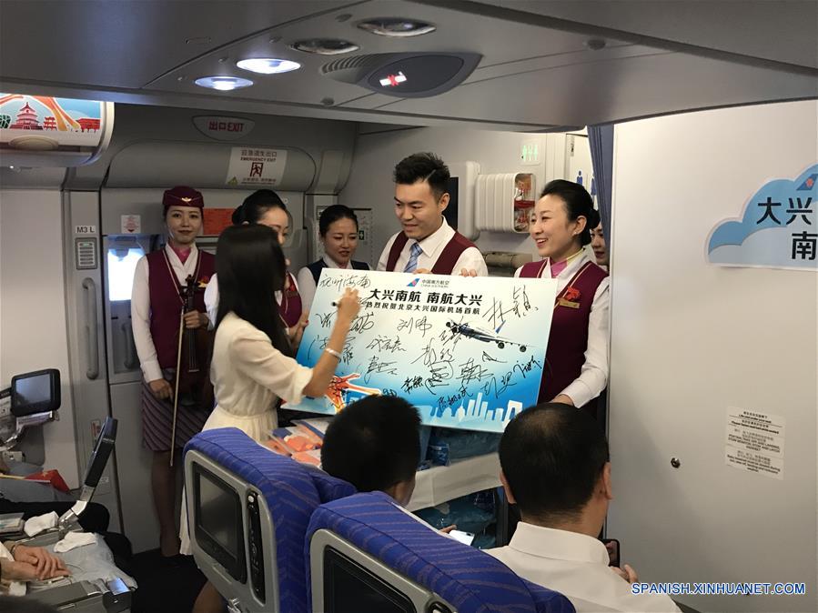 Una pasajera firma un cartel a bordo del vuelo CZ3001 de China Southern Airlines, el 25 de septiembre de 2019. El nuevo Aeropuerto Internacional Daxing de Beijing inauguró sus vuelos con el CZ3001 de China Southern Airlines que despegó el miércoles por la tarde. El vuelo inaugural hizo la ruta entre Beijing y Guangzhou en el sur de China. Después de éste, otras seis aerolíneas chinas iniciaron sus respectivos primeros vuelos vía el nuevo aeropuerto. (Xinhua/Tai Sicong)