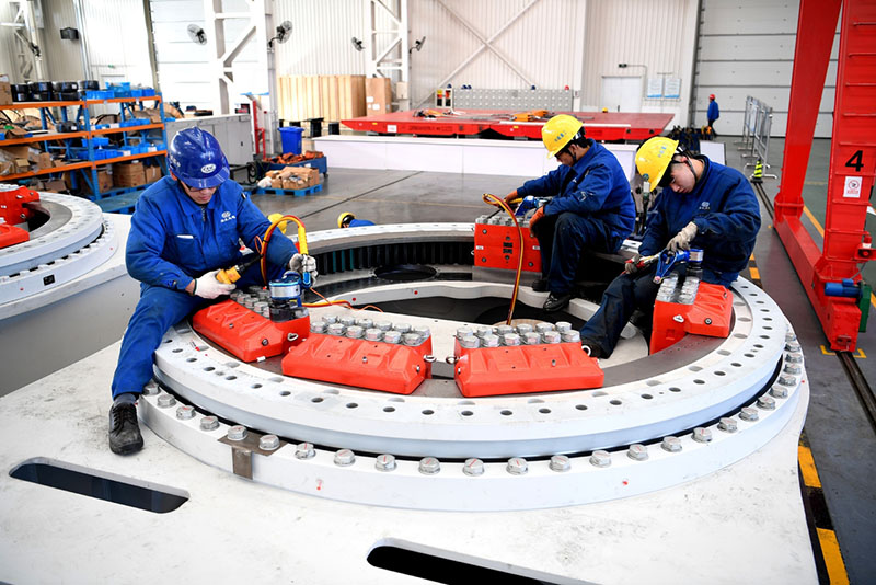 Los empleados de una subsidiaria de China Shipbuilding Industry Corp instalan equipos de energía limpia en Nantong, provincia de Jiangsu. [Foto / Xinhua]