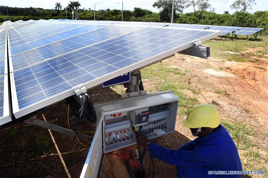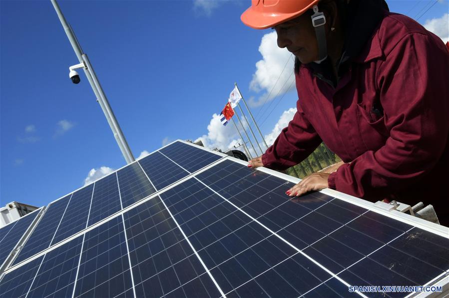 Imagen del 15 de octubre de 2019 de un obrero revisando el funcionamiento de los paneles solares del Parque solar fotovoltaico Pinar 220 A2, en las afueras de la ciudad de Pinar del Río, Cuba. Las banderas de Cuba y China sobresalen sobre el Parque solar fotovoltaico Pinar 220 A2, erigido sobre unas 5,8 hectáreas a unos 10 kilómetros al sur de Pinar del Río, con una donación china de recursos y tecnología. La instalación, que comenzó a operar en febrero de 2018 luego de un a?o y medio de trabajos constructivos, tiene más de 15.500 paneles fabricados por la empresa china Yingli, de la provincia de Hebei, en el norte de China. (Xinhua/Joaquín Hernández)
