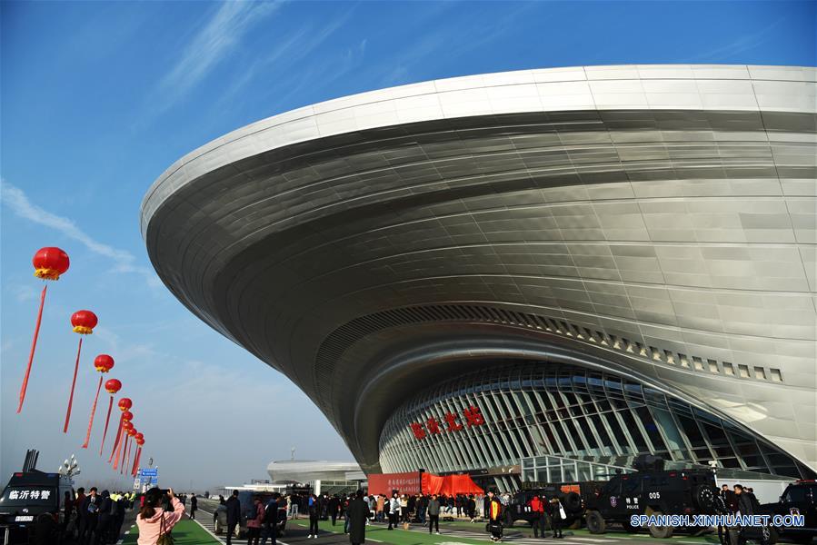 Imagen del 26 de noviembre de 2019 de la Estación Linyi Norte, en la provincia de Shandong, en el este de China. Una línea ferroviaria entró el martes en funcionamiento en la provincia de Shandong, en el este de China, trayendo las monta?as Yimeng, una antigua base revolucionaria, a la red ferroviaria de alta velocidad de rápido desarrollo del país por primera vez. La sección recién lanzada, que une a Rizhao y Qufu, ambas en Shandong, se extiende 235 kilómetros con una velocidad dise?ada máxima de 350 kilómetros por hora, reduciendo el tiempo de viaje entre las dos ciudades a 1 hora 14 minutos, de las 3 horas y 13 minutos actuales. (Xinhua/Wang Kai)