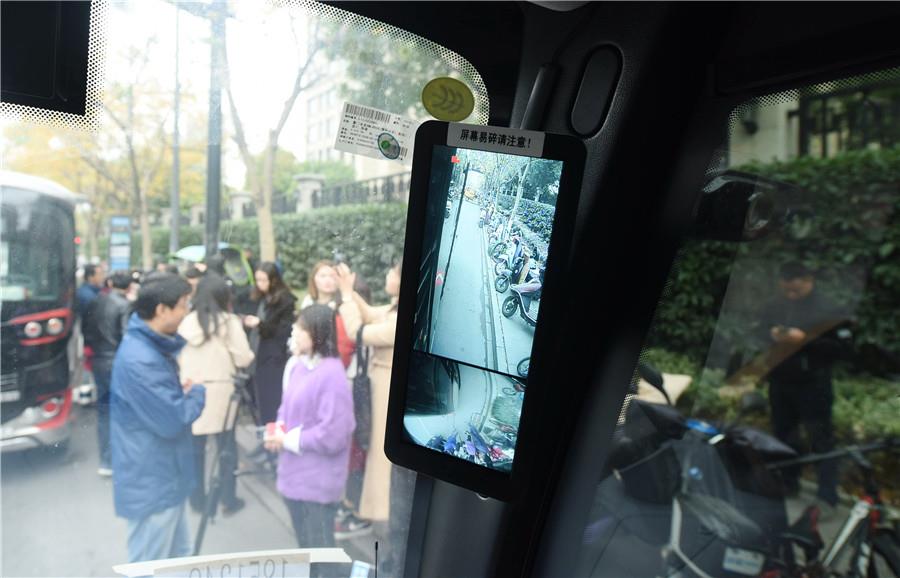 El espejo retrovisor electrónico del minibús sin conductor con tecnología 5G en Hangzhou, provincia de Zhejiang, este de China, el 26 de noviembre de 2019. [Foto / Asianewsphoto]