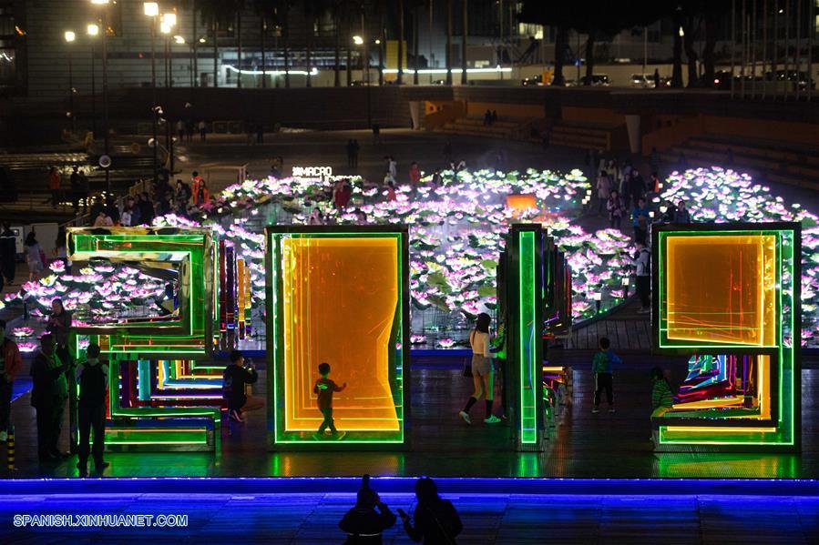 MACAO, 1 diciembre, 2019 (Xinhua) -- Visitantes disfrutan de las vistas nocturnas durante el Festival de Luces de Macao 2019, en Macao, en el sur de China, el 1 de diciembre de 2019. (Xinhua/Cheong Kam Ka)