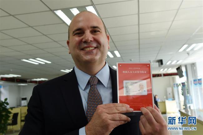 Un extranjero muestra su tarjeta de residencia permanente en Beijing el 16 de junio de 2017. [Foto de archivo: Xinhua]