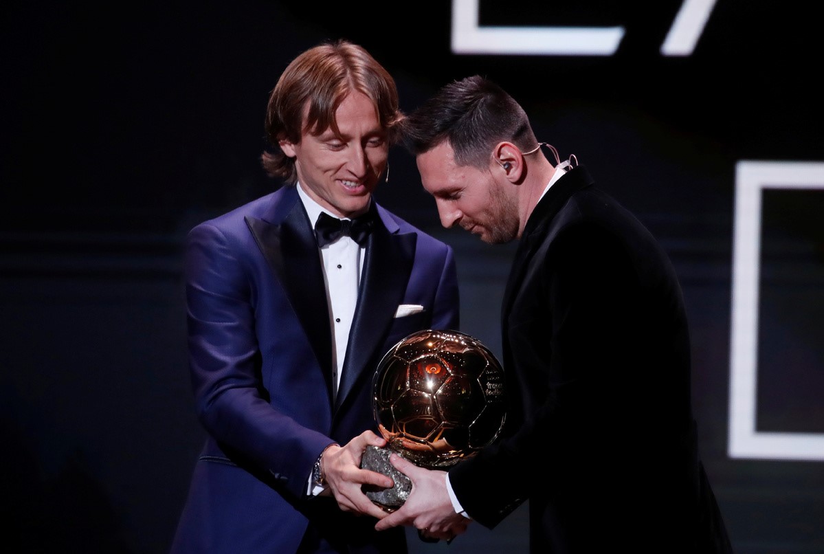 Luka Modric, del Real Madrid, y Lionel Messi, del Barcelona, durante la ceremonia de entrega del Balón de Oro, Theatre du Chatelet, París, Francia, 2 de diciembre del 2019. [Foto: Agencias]