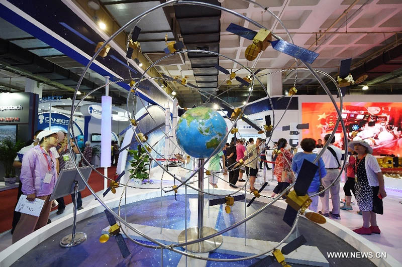 Un modelo del sistema satelital de navegación BeiDou se exhibe en la XX Exposición Internacional de Alta Tecnología de China Beijing, el 9 de junio de 2017. [Foto / Xinhua]