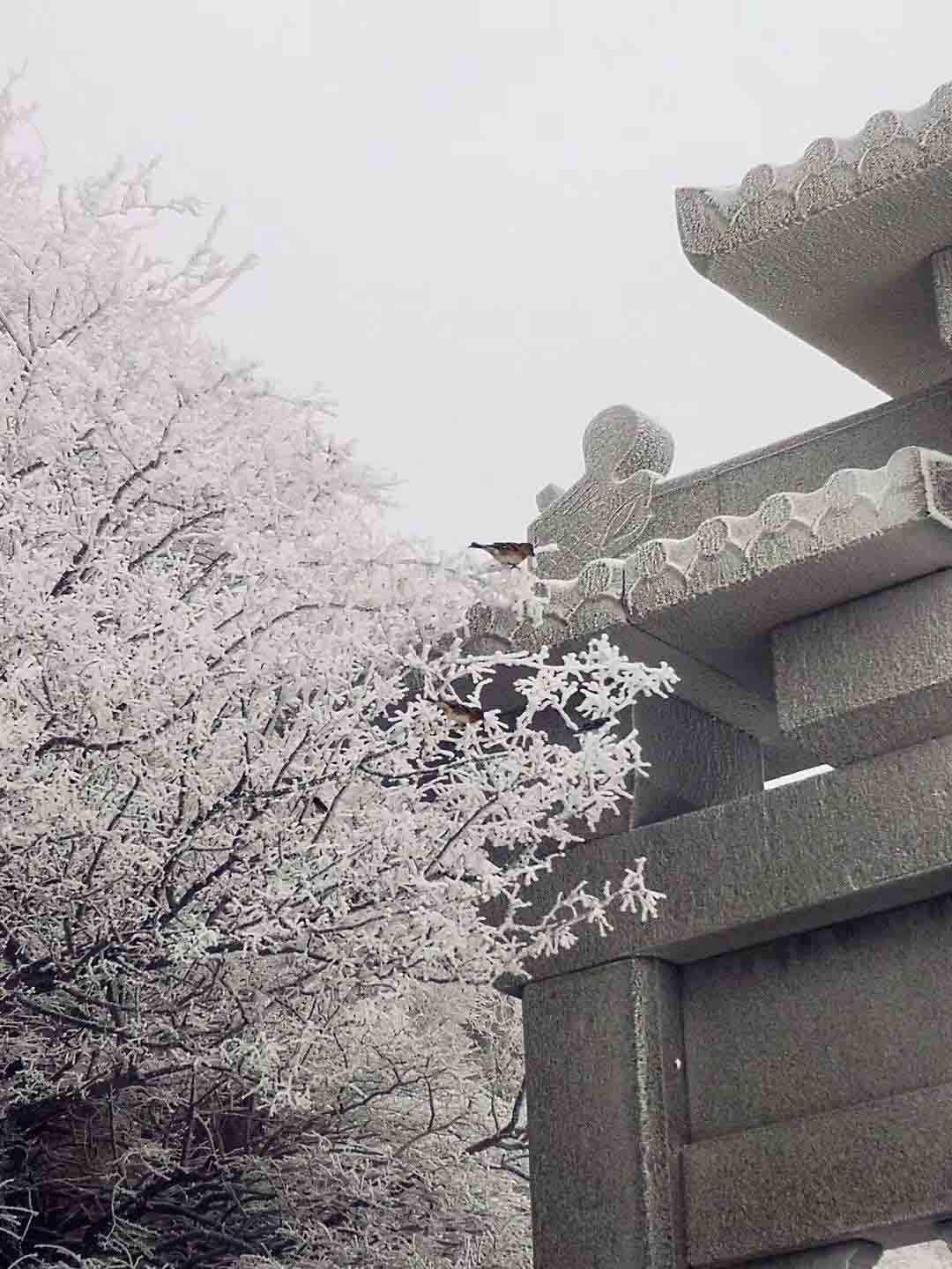 Los árboles de la monta?a Taishan, en la provincia de Shandong, cubiertos de escarcha. [Foto de Han Fuying / para chinadaily.com.cn]
