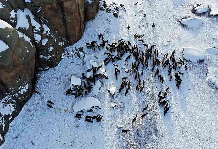 Una imagen aérea del 29 de diciembre del 2019 muestra a los pastores con su ganadería en invierno durante el segundo Festival de Turismo Cultural de Sawur, relacionado con la ganadería, en el condado Jeminay de la región autónoma Uigur de Xinjiang, en el noroeste de China, el 29 de diciembre del 2019. (Xinhua/Song Yanhua)