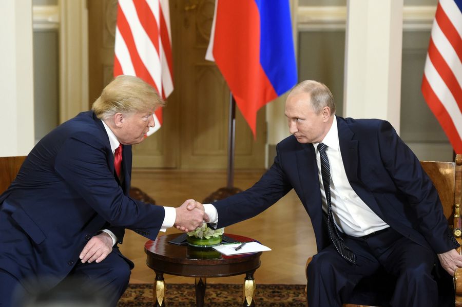 El presidente de Estados Unidos, Donald Trump (i), estrecha la mano con su homólogo de Rusia, Vladimir Putin (d), en Helsinki, Finlandia, el 16 de julio de 2018. (Xinhua/Lehtikuva/Heikki Saukkomaa)