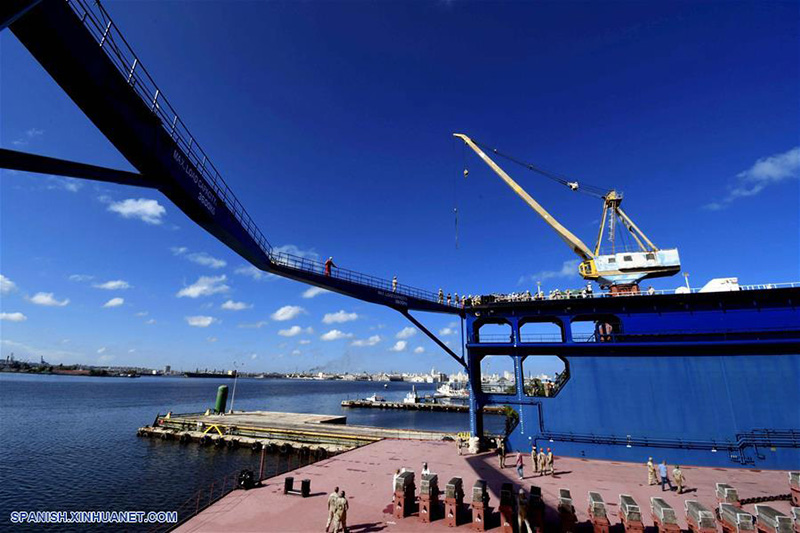 Personas caminan por un dique flotante atracado en un astillero de la bahía de La Habana, Cuba, el 30 de octubre de 2019. Las autoridades cubanas recibieron el miércoles, de manera oficial, un moderno dique flotante construido en los astilleros de la empresa china Huarun Dadong Dockyard, con un crédito otorgado por el gobierno chino. (Xinhua/Joaquín Hernández)