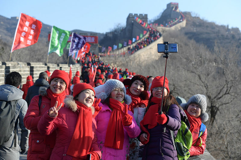 Un grupo de personas hace fotos en la sección de Badaling de la Gran Muralla para pedir bendiciones en el día de A?o Nuevo, el 1 de enero de 2020. [Foto de Wei Xiaohao / chinadaily.com.cn]