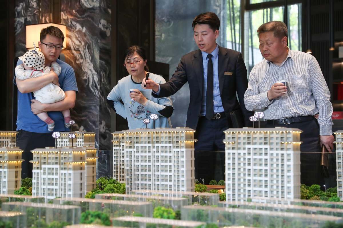 Los potenciales compradores de vivienda examinan modelos de propiedades en un sitio de ventas en Shanghai. [Foto proporcionada a China Daily]