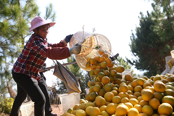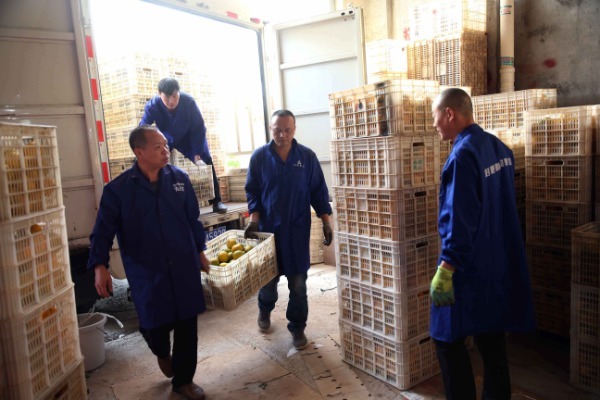 Li Fashun (izquierda) y sus compa?eros de trabajo trasladan las naranjas ombligo al almacén. [Foto: Chen Zebing/China Daily]