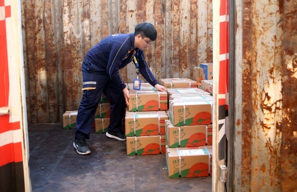 El personal de logística traslada las naranjas ombligo a los camiones para enviarlas a múltiples zonas del país. [Foto: Chen Zebing/China Daily]