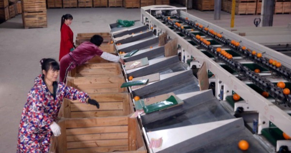 Trabajadoras de una línea de clasificación automática de naranjas ombligo. [Foto: Chen Zebing/China Daily]