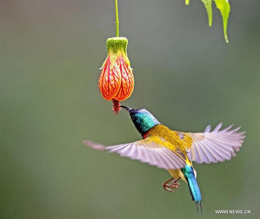 Un pájaro sol de cola bifurcada (( Aethopyga christinae) liba el néctar de una flor en el Parque del Lago del Oeste, en Fuzhou, capital de la provincia de Fujian, 3 de enero del 2020. (Foto: Mei Yongcun/ Xinhua)