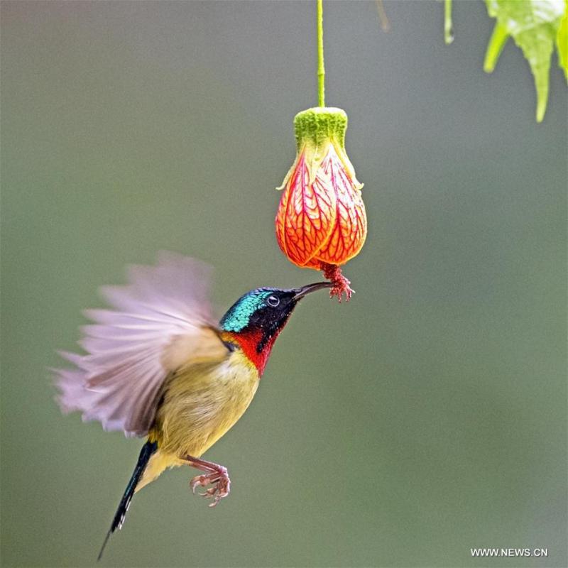 Un pájaro sol de cola bifurcada (( Aethopyga christinae) liba el néctar de una flor en el Parque del Lago del Oeste, en Fuzhou, capital de la provincia de Fujian, 3 de enero del 2020. (Foto: Mei Yongcun/ Xinhua)