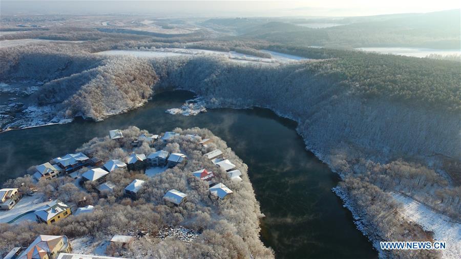 La foto aérea, tomada el 11 de enero de 2020, muestra el paisaje de árboles cubiertos de escarcha en el Geoparque Global de Jingpohu, en Mudanjiang, provincia de Heilongjiang, en el noreste de China. (Foto/ Zhang Chunxiang/Xinhua)