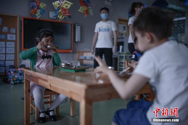 El 2 de junio, los ni?os peque?os desayunaron en una guardería de Tianjin. El mismo día, se reanudaron las clases de los grados 1, 2 y 3 de las escuelas primarias y guarderías en Tianjin. Por Tong Yu, Chinanews.com.