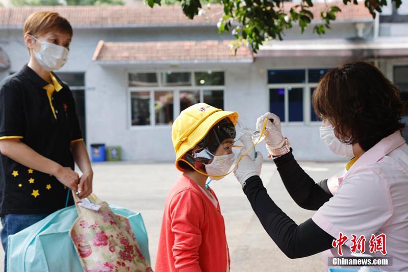 El 2 de junio, en la guardería New Century de Hongqiao en Shanghai, la maestra midió la temperatura corporal de los ni?os. El mismo día, se abrieron las instituciones públicas de cuidado infantil de la ciudad en Shanghai. Por Yin Liqin, Chinanews.com.