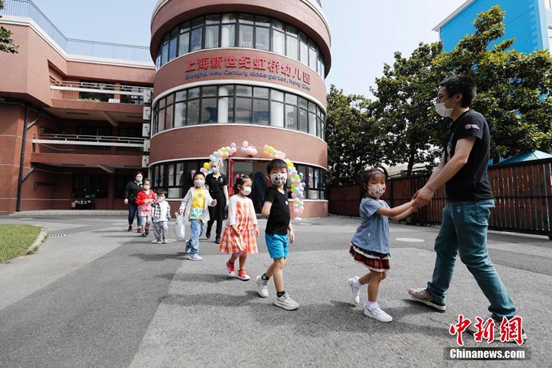 El 2 de junio, en la guardería New Century de Hongqiao en Shanghai, la maestra guió a los alumnos por el patio de manera ordenada. El mismo día, se abrieron las instituciones públicas de cuidado infantil de la ciudad en Shanghai. Por Yin Liqin, Chinanews.com.