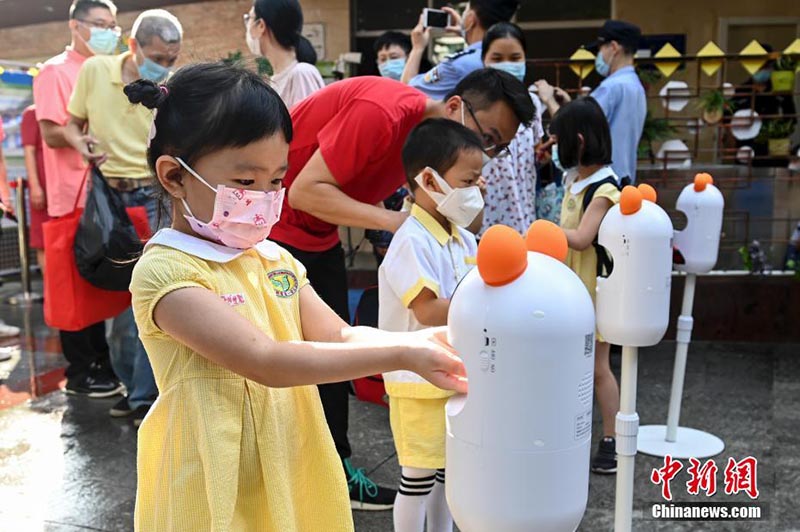 El 2 de junio, los ni?os en la Primera Guardería de Guangzhou, en el distrito Yuexiu de Guangzhou, provincia de Guangdong, se lavaron las manos y se desinfectaron después de entrar en la guardería. El mismo día, las guarderías en la provincia de Guangdong que cumplían con las condiciones para abrir sus instalaciones volvieron a las aulas, y los ni?os regresaron en etapas y lotes. Por Chen Jimin, Chinanews.com.