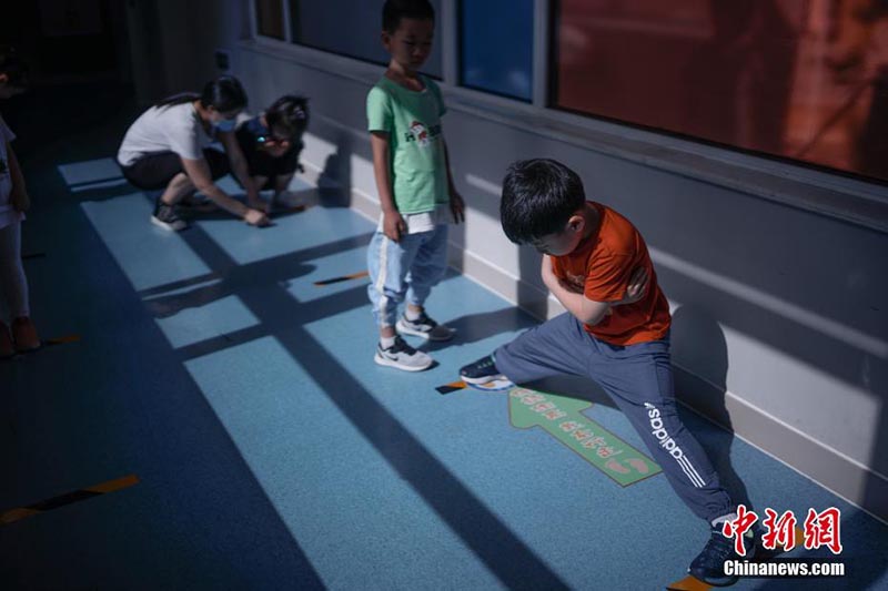 Tianjin, 03/06/2020 (El Pueblo en Línea) - El 2 de junio, en una guardería de Tianjin, un ni?o peque?o midió la distancia de seguridad de un metro con sus pies. El mismo día, se reanudaron las clases de los grados 1, 2 y 3 de las escuelas primarias y guarderías en Tianjin. Por Tong Yu, Chinanews.com.