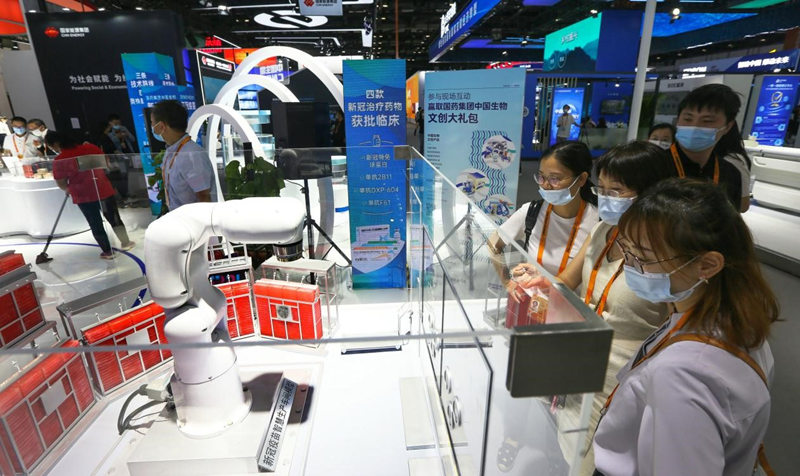 Los visitantes observan un modelo de producción inteligente de vacunas contra COVID-19 en la Feria Comercial de Servicios Internacionales de China en el Centro Nacional de Convenciones de Beijing, el 1 de septiembre de 2022. Foto de Luo Wei/Diario del Pueblo