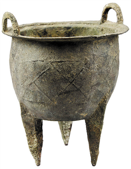 Un trípode de bronce conocido como ding, desenterrado del sitio. [Foto proporcionada a China Daily]