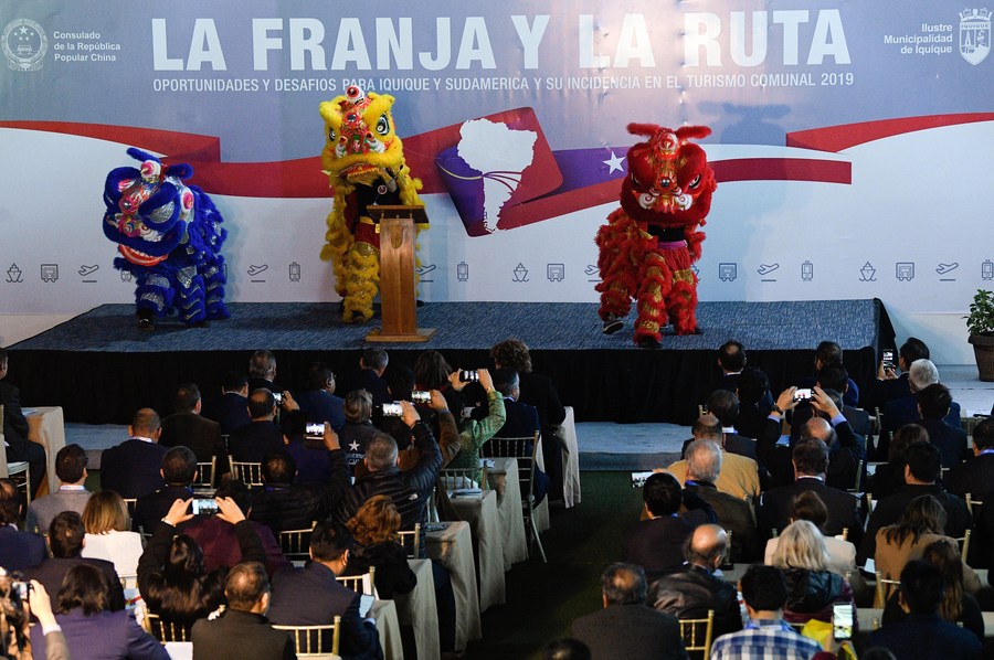 Artistas interpretan la danza del león durante la inauguración de un foro sobre la iniciativa de la Franja y la Ruta, propuesta por China, en la ciudad de Iquique, Chile, el 25 de julio de 2019. (Xinhua/Jorge Villegas)