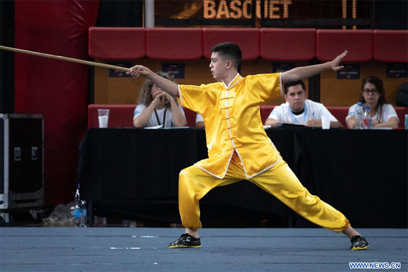 BUENOS AIRES, 15 noviembre, 2022 (Xinhua) -- Imagen del 12 de noviembre de 2022 de un atleta compitiendo en la categoría de Kung Fu con armas largas durante el Tercer Campeonato Sudamericano de Kung Fu en el Polideportivo Roberto Pando, en Buenos Aires, Argentina. Argentina celebró una verdadera fiesta del Wushu o Kung Fu con el Tercer Campeonato Sudamericano de esta modalidad de las artes marciales, realizado del 10 al 14 de noviembre en la ciudad de Buenos Aires, organizado por la Federación Suramericana de la disciplina. (Xinhua/Martín Zabala)