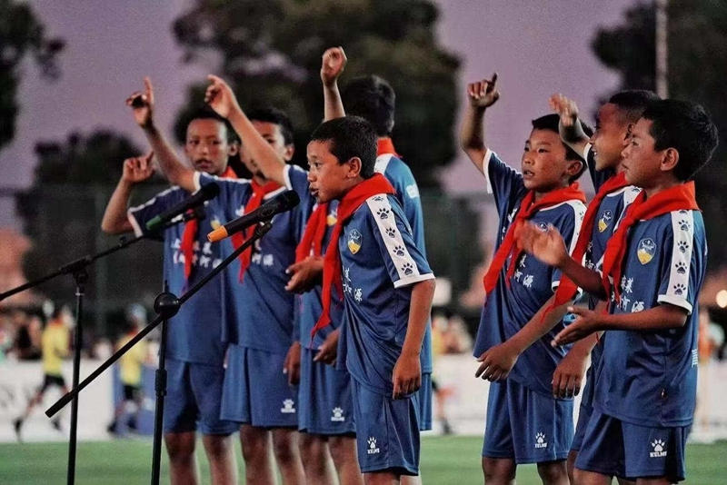 Miembros de un equipo de fútbol del condado de Qumalai cantan la canción "Fly" en la ceremonia de apertura de la final de una competencia nacional de fútbol para estudiantes de primaria celebrada en Suzhou, provincia de Jiangsu. (Foto: Trinlin Phuntsog)