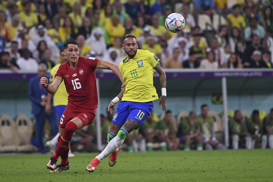 Neymar (i), de Brasil, compite con Sasa Lukic, de Serbia, durante el partido del Grupo G entre Brasil y Serbia en la Copa Mundial de la FIFA 2022 en el Estadio Lusail, en Lusail, Qatar, el 24 de noviembre de 2022. (Xinhua/Xu Zijian)