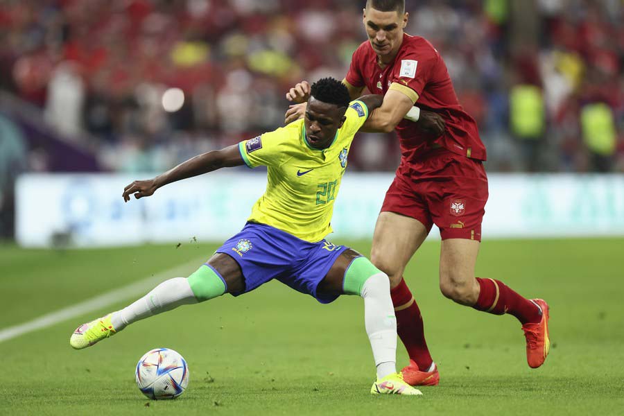 Vinicius Junior (i), de Brasil, compite durante el partido del Grupo G entre Brasil y Serbia en la Copa Mundial de la FIFA 2022 en el Estadio Lusail, en Lusail, Qatar, el 24 de noviembre de 2022. (Xinhua/Lan Hongguang)