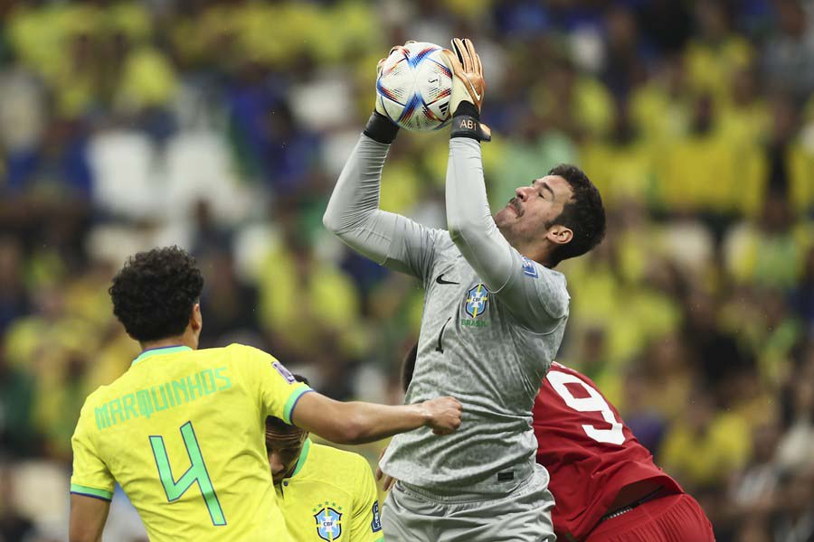 Alisson (d), guardameta de Brasil, salva el balón durante el partido del Grupo G entre Brasil y Serbia en la Copa Mundial de la FIFA 2022 en el Estadio Lusail, en Lusail, Qatar, el 24 de noviembre de 2022. (Xinhua/Lan Hongguang)