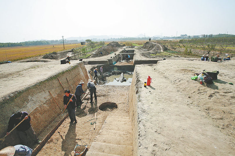 La gente trabaja en un sitio de excavación que muestra las ruinas de la ciudad de Liangzhu. [Foto proporcionada a China Daily]