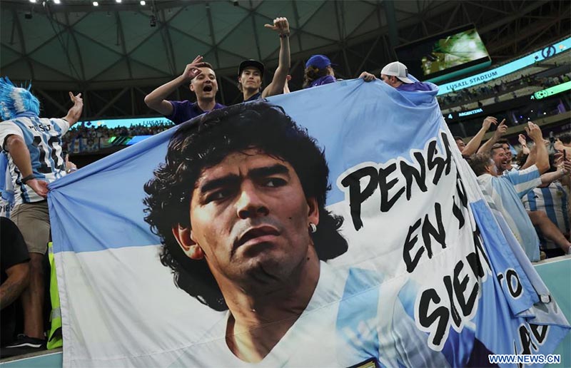Aficionados de Argentina muestran una bandera con el retrato de Diego Maradona al término del partido correspondiente a los cuartos de final entre Países Bajos y Argentina en la Copa Mundial de la FIFA 2022, en el Estadio Lusail, en Lusail, Qatar, el 9 de diciembre de 2022. (Xinhua/Zheng Huansong)