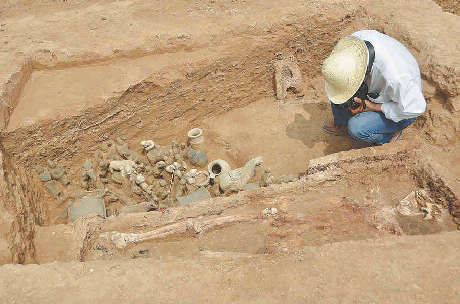 Los arqueólogos toman fotos de las reliquias en la tumba M113 que se encontró en el centro del grupo y produjo un total de 51 artefactos antiguos. [Foto: proporcionada a China Daily]