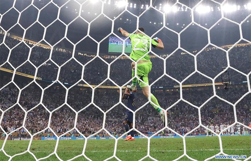 Emiliano Martínez, guardameta de Argentina, festeja haber atajado el disparo de Kingsley Coman, de Francia, durante la tanda de penales del partido correspondiente a la final entre Argentina y Francia en la Copa Mundial de la FIFA 2022, en el Estadio Lusail, en Lusail, Qatar, el 18 de diciembre de 2022. (Xinhua/Cao Can)
