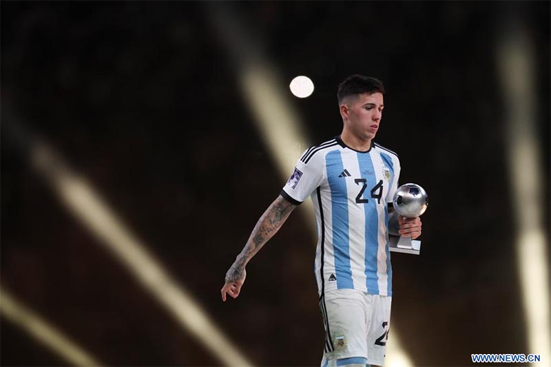 Enzo Fernández, de Argentina, reacciona con el premio a Jugador Joven de la FIFA durante la ceremonia de premiación de la Copa Mundial de la FIFA 2022, en el Estadio Lusail, en Lusail, Qatar, el 18 de diciembre de 2022. (Xinhua/Li Ming)