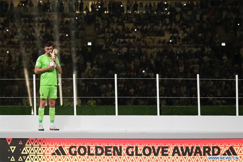 Emiliano Martínez, guardameta de Argentina, besa su trofeo del guante de oro durante la ceremonia de premiación de la Copa Mundial de la FIFA 2022, en el Estadio Lusail, en Lusail, Qatar, el 18 de diciembre de 2022. (Xinhua/Cao Can)