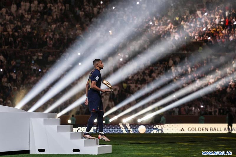 Kylian Mbappe, de Francia, reacciona con su trofeo de bota de oro durante la ceremonia de premiación de la Copa Mundial de la FIFA 2022, en el Estadio Lusail, en Lusail, Qatar, el 18 de diciembre de 2022. (Xinhua/Li Ming)