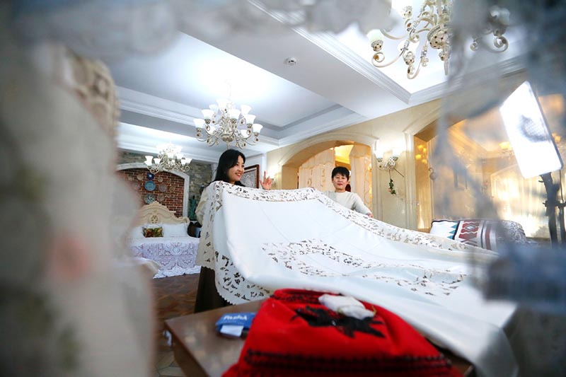 Los miembros del personal de marketing promueven obras de arte de encaje a través de una transmisión en vivo en el distrito de Jimo, Qingdao, provincia de Shandong, en el este de China, el 18 de diciembre de 2022. [Foto: Xinhua]