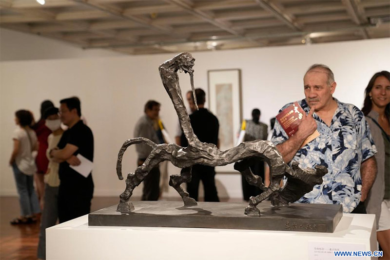 MONTEVIDEO, 23 diciembre, 2022 (Xinhua) -- Imagen del 22 de diciembre de 2022 de un hombre observando una escultura durante la inauguración de la exposición "Xieyi Chino. Obras Seleccionadas del Museo Nacional de Arte de China", en el Museo Nacional de Artes Visuales, en Montevideo, capital de Uruguay. La exposición "Xieyi Chino. Obras Seleccionadas del Museo Nacional de Arte de China", se presenta del 22 de diciembre al 9 de marzo próximo en la ciudad uruguaya de Montevideo, exhibición de arte contemporáneo chino considerada un hito del intercambio cultural. (Xinhua/Nicolás Celaya)