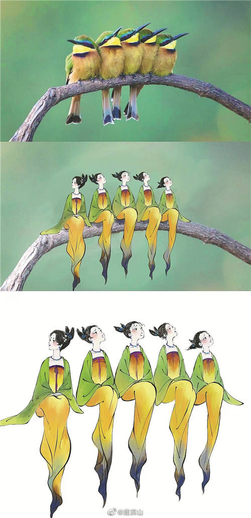 Comparaciones de pájaros con las obras de arte de Liu basadas en los personajes que inspiran. [Foto proporcionada a China Daily]