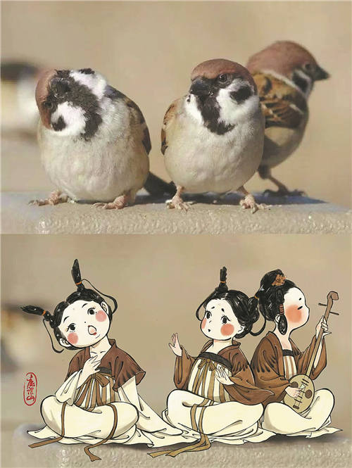 Comparaciones de pájaros con las obras de arte de Liu basadas en los personajes que inspiran. [Foto proporcionada a China Daily]
