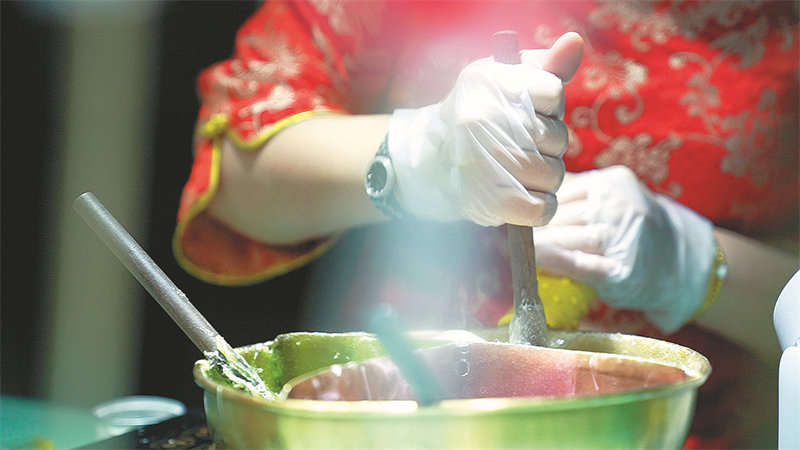 Wang prepara jarabe de azúcar en un tazón. [Foto: China Daily]